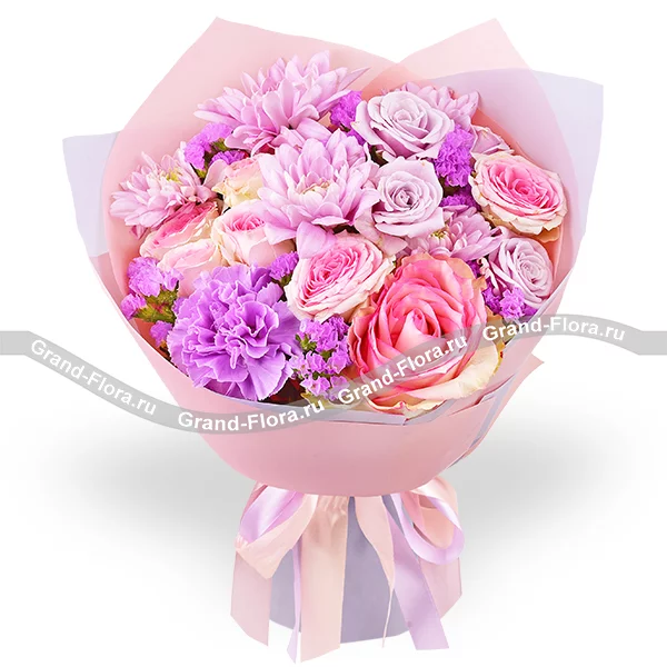 Букет выполнен из роз нежно – розовых и фиолетовых оттенков,  кустовой хризантемы сиреневого оттенка и гвоздики в тон композиции,  финальные аккорды статицы, в окружении невесомого розово – фиолетового фетра и ленты, завершают букет, делая его изысканным и элегантным.  Букет составляет от 30см в высоту, а диаметр от 20см до 35см, в зависимости от выбранного Вами варианта. Обращаем Ваше внимание, что состав и оформление букета могут отличаться.